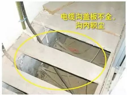 電纜溝蓋板不完整,溝內積有灰塵。
